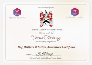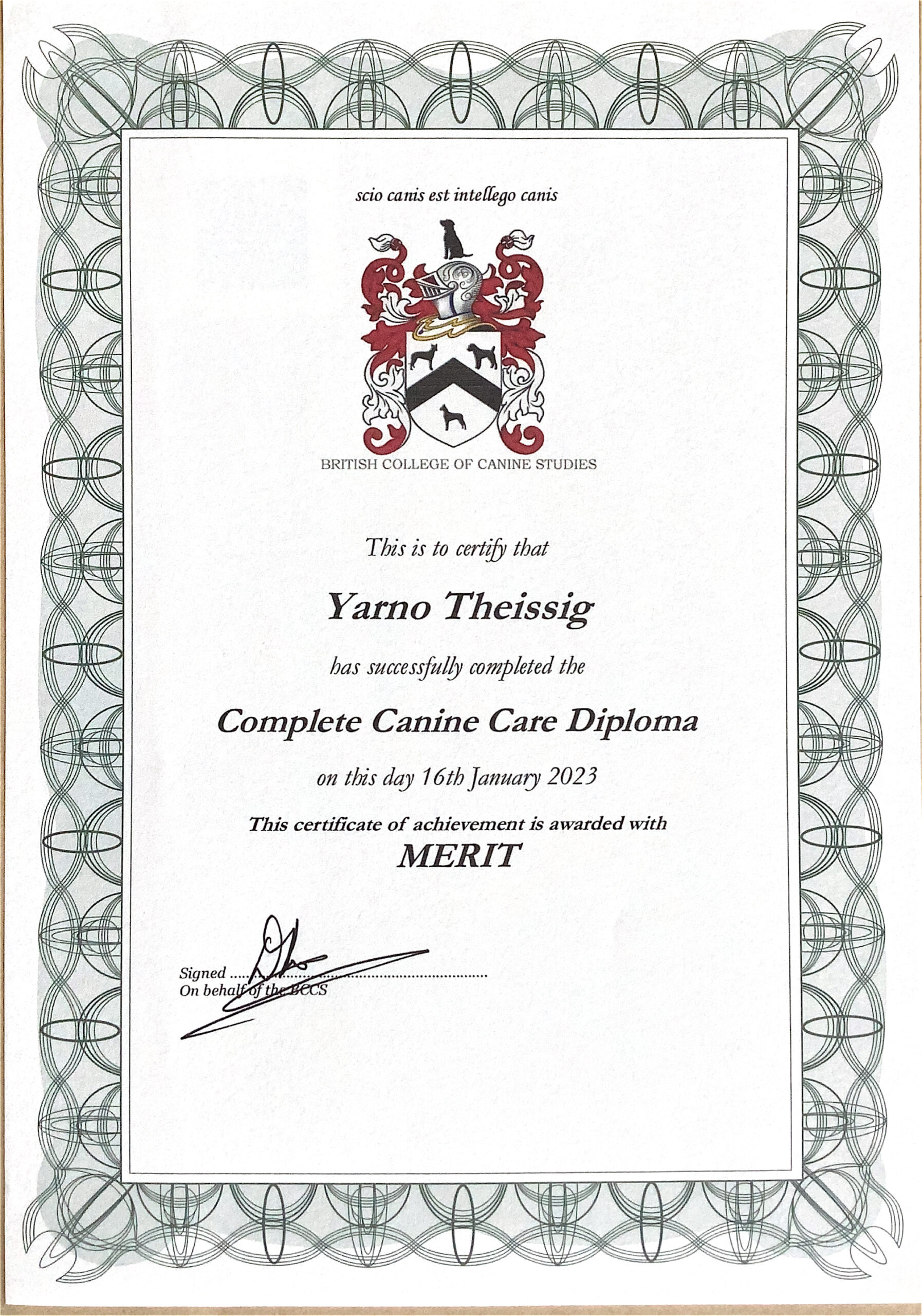 Studium/Weiterbildung: Tierpsychologie zert., erste Hilfe kurs Hund, verantwortlicher Hundehalter zert., Ernährung & alternativ Gesundheit cert., Prof. Dog walker & sitter zert., complete canine care dipl.